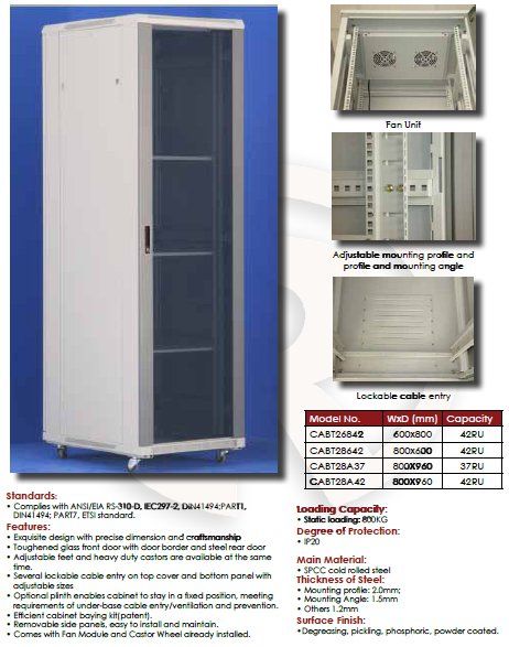 42RU x 800mmW x 600mmD Network Cabinet Tinted Glass front door, Metal lockable sides & back. vertical cable management on sides Roof fan tray with 4 fans is fitted. Castor rails are fitted. Leveling feet can be fitted. Max carrying cap 600Kg.