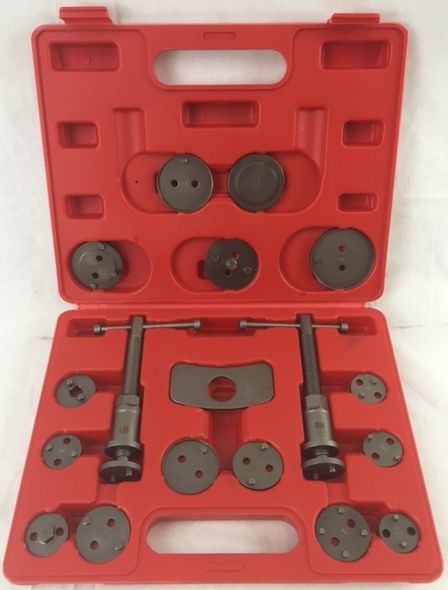Ideal professional tool kit for winding back brake calliper pistons for removal and installation of brake pads.